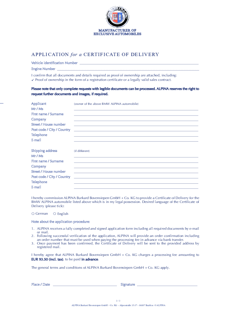 Get the free CERTIFICATE OF DELIVERY - ALPINA Automobiles