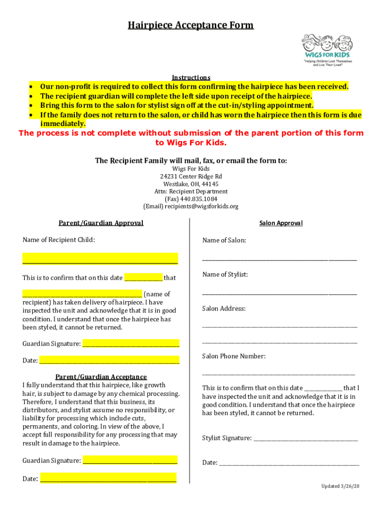 Hairpiece Acceptance FormInstructions Our nonprofit is required to collect this form confirming the hairpiece has been received. The recipient guardian will complete the left side upon receipt of