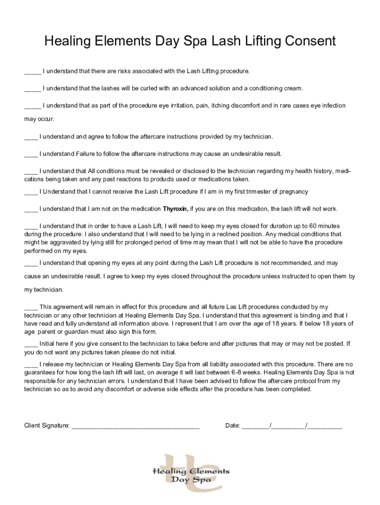 Healing Elements Day Spa Lash Lifting Consent ___ I understand that there are risks associated with the Lash Lifting procedure. ___ I understand that the lashes will be curled with an advanced solution