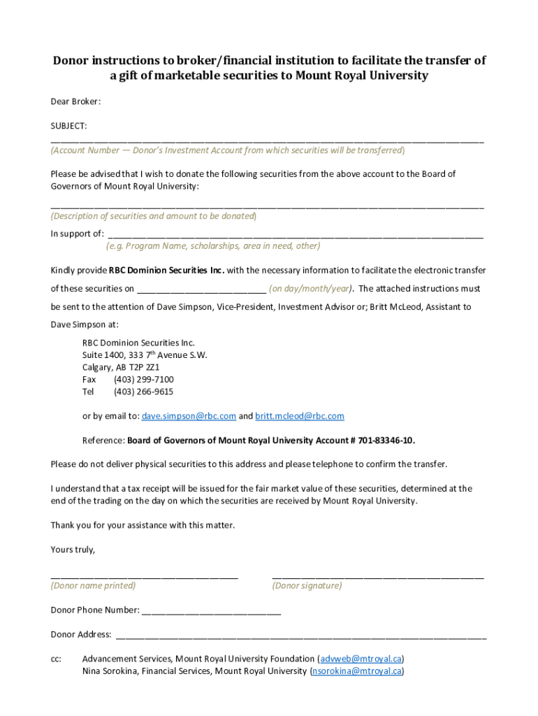 Donor instructions to broker/financial institution to facilitate the transfer of a gift of marketable securities to Mount Royal University Dear Broker: SUBJECT: ___ (Account Number Donors Investment