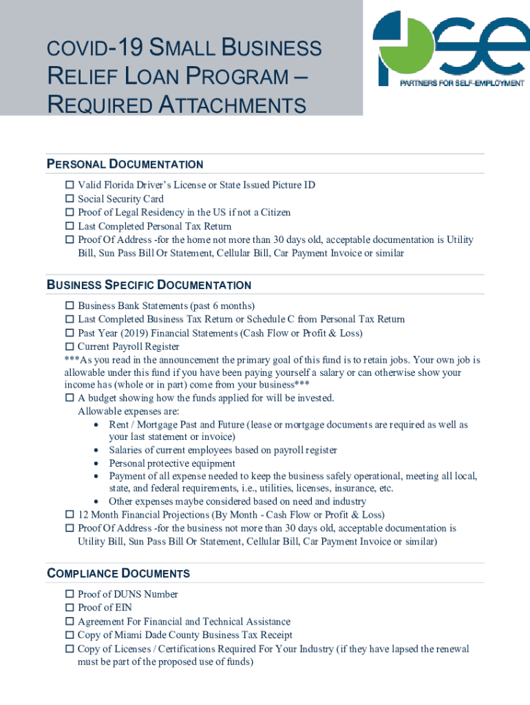 COVID-19 SMALL BUSINESS RELIEF LOAN PROGRAM REQUIRED ATTACHMENTS PERSONAL DOCUMENTATION Valid Florida Driver's License or State Issued Picture ID Social Security Card Proof of Legal Residency in the