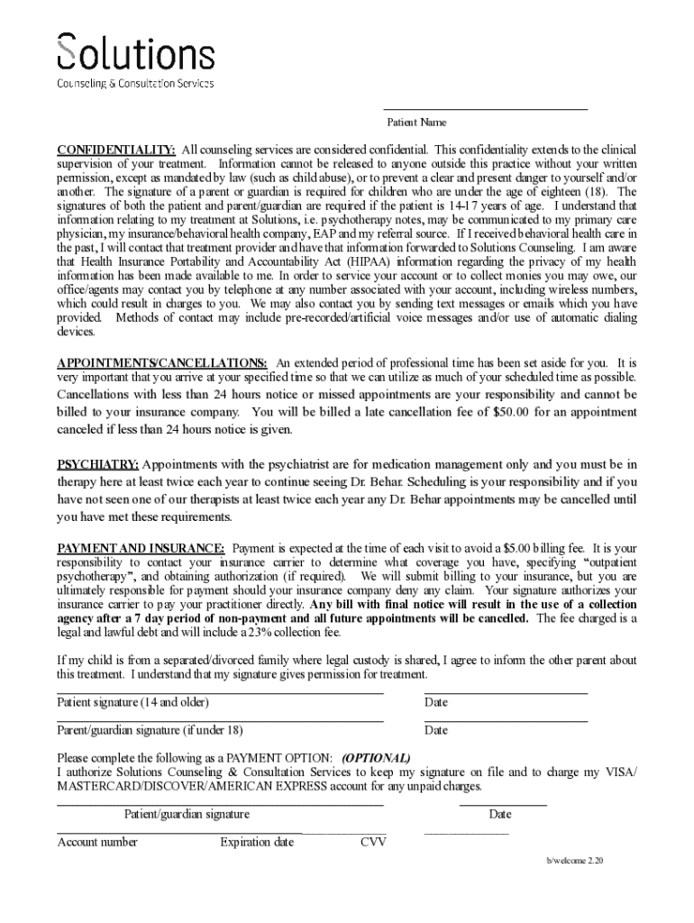 CONFIDENTIALITY: All counseling services are considered confidential. This confidentiality extends to the clinical supervision of your treatment. Information cannot be released to anyone outside this