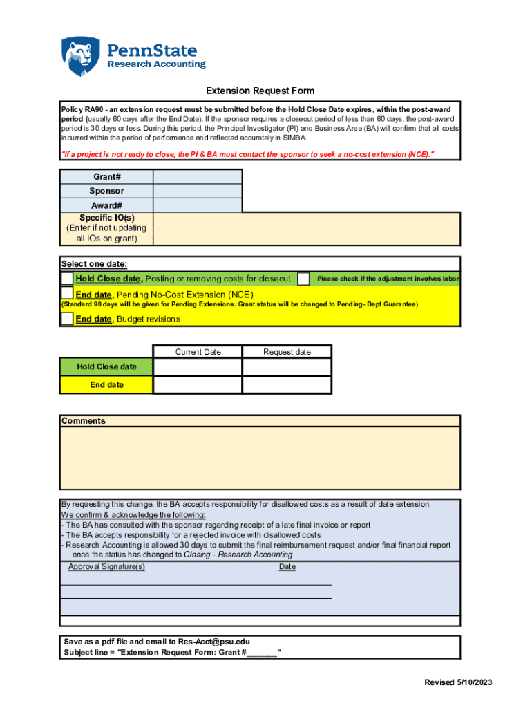 Extension Request Form Policy RA90 an extension request must be submitted before the Hold Close Date expires, within the postaward period (usually 60 days after the End Date). If the sponsor requires