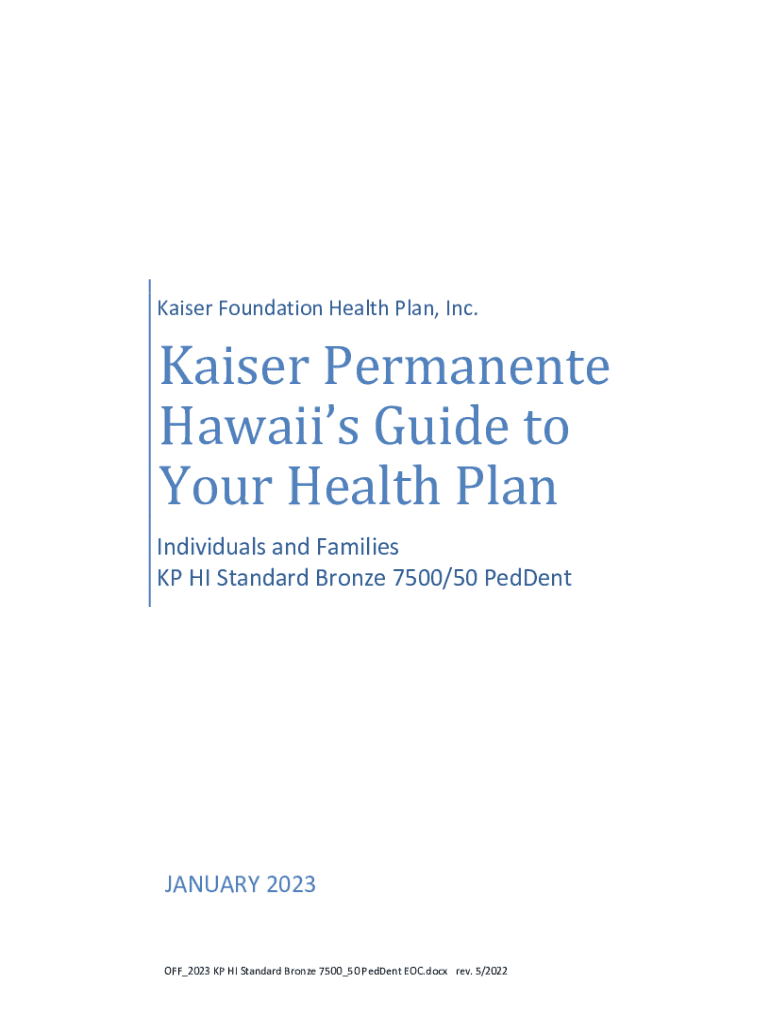 Kaiser Foundation Health Plan, Inc. Kaiser Permanent Hawaii's Guide to Your Health PlanIndividuals and Families KP HI Standard Bronze 7500/50 PedDentJANUARY 2023 OFF_2023 KP HI Standard Bronze 7500_50