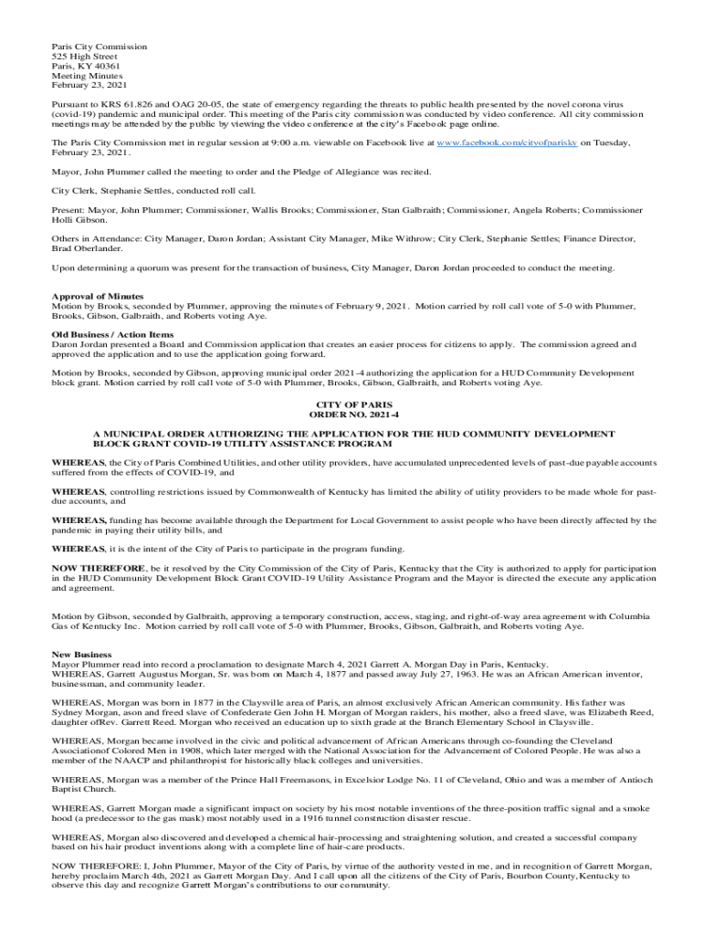 Paris City Commission 525 High Street Paris, KY 40361 Meeting Minutes February 23, 2021, Pursuant to MRS 61.826 and TAG 2005, the state of emergency regarding the threats to public health presented