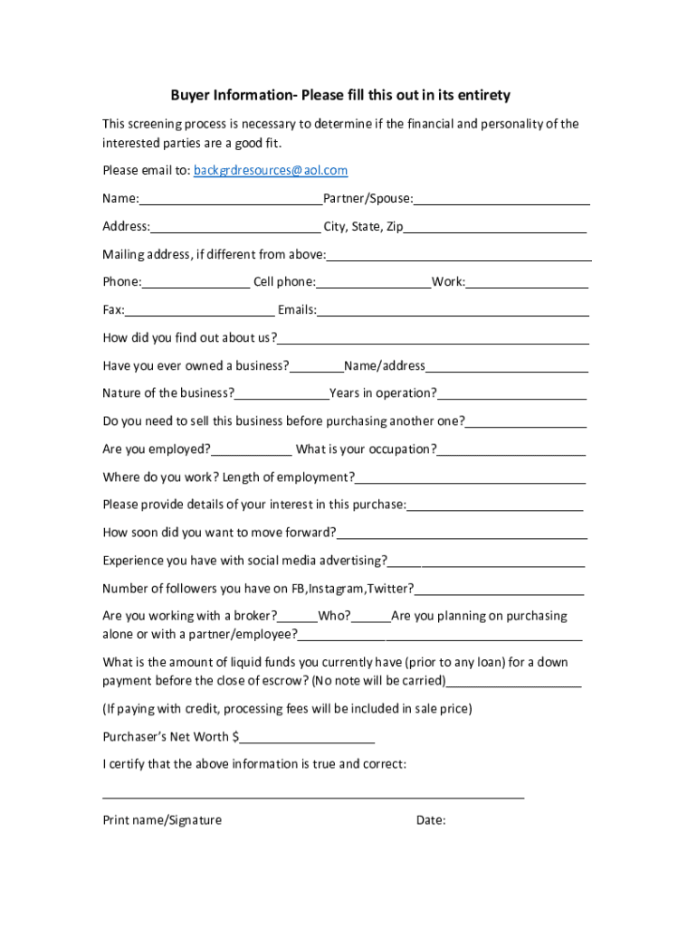 Buyer Information Please fill this out in its entirety This screening process is necessary to determine if the financial and personality of the interested parties are a good fit. Please email to: