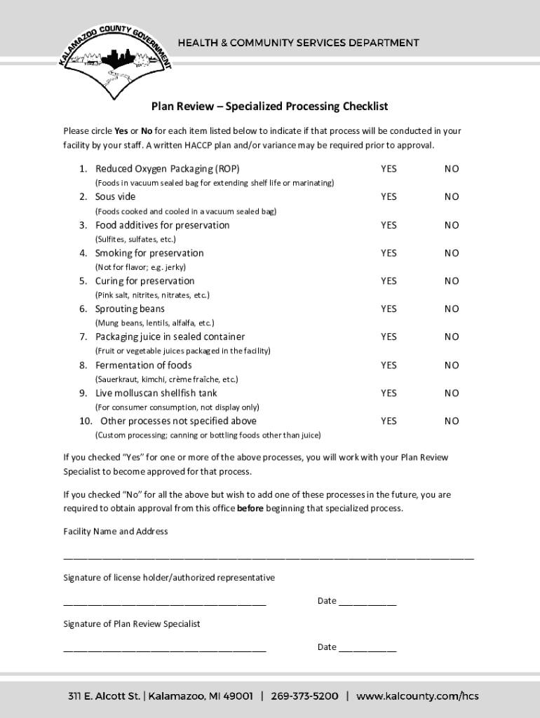 Plan Review Specialized Processing Checklist Please circle Yes or No for each item listed below to indicate if that process will be conducted in your facility by your staff. A written HACCP plan and/or