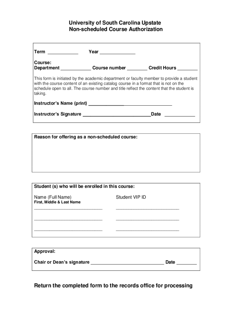 University of South Carolina Upstate Nonscheduled Course AuthorizationTerm ___Year ___Course: Department ___ Course number ___ Credit Hours ___ This form is initiated by the academic department or