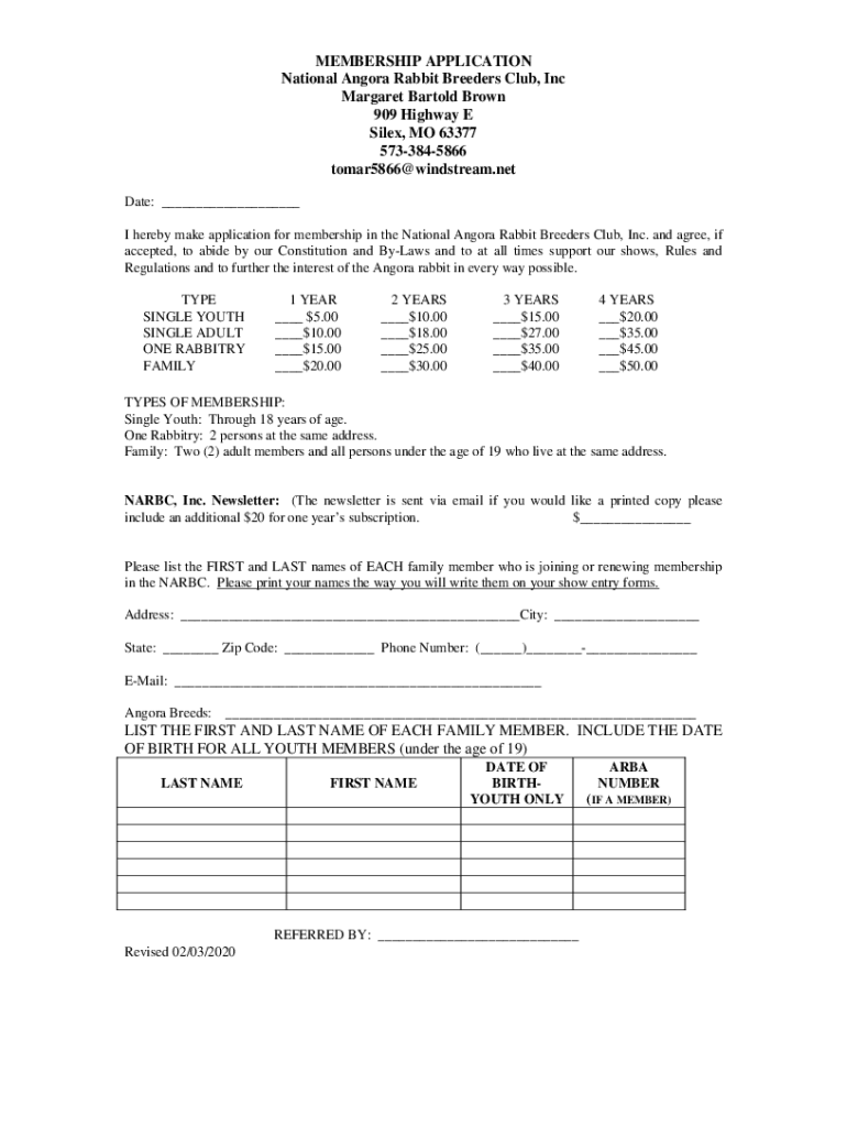 MEMBERSHIP APPLICATION National Angora Rabbit Breeders Club, Inc Margaret Bar told Brown 909 Highway E Side, MO 63377 5733845866 tomar5866@windstream.net Date: ___ I hereby make application for membership