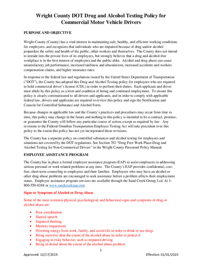 Wright County DOT Drug and Alcohol Testing Policy for Commercial Motor Vehicle Drivers PURPOSE AND OBJECTIVE Wright County (County) has a vital interest in maintaining safe, healthy, and efficient