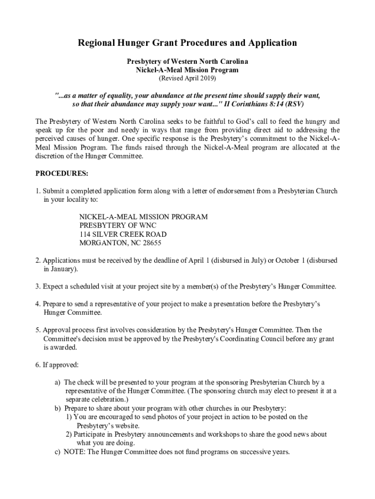 Regional Hunger Grant Procedures and Application Presbytery of Western North Carolina NickelAMeal Mission Program (Revised April 2019)\”...as a matter of equality, your abundance at the present