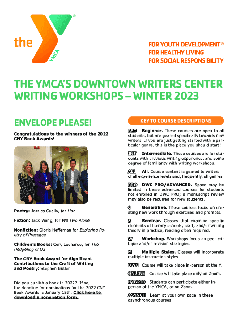 THE YMCA DOWNTOWN WRITERS CENTER WRITING WORKSHOPS WINTER 2023 ENVELOPE PLEASE! Congratulations to the winners of the 2022 CNY Book Awards!KEY TO COURSE DESCRIPTIONS BEG Beginner. These courses are