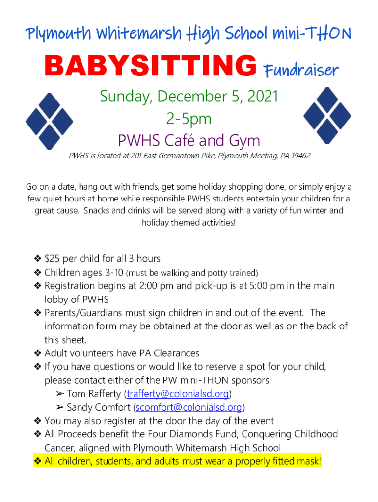Plymouth White marsh High School miniTHONBABYSITTING Fundraiser Sunday, December 5, 2021 25pm PHS CAF and Gym PHS is located at 201 East Germantown Pike, Plymouth Meeting, PA 19462Go on a date, hang