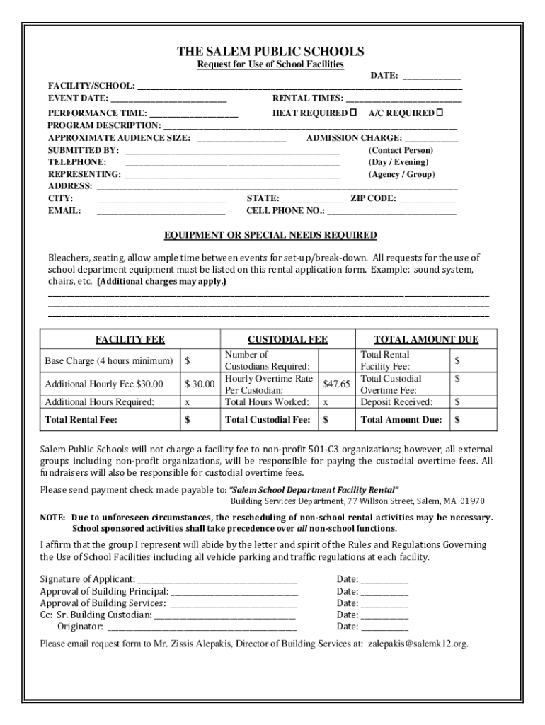 THE SALEM PUBLIC SCHOOLS Request for Use of School Facilities DATE: ___ FACILITY/SCHOOL: ___ EVENT DATE: ___ RENTAL TIMES: ___ PERFORMANCE TIME: ___ HEAT REQUIRED A/C REQUIRED PROGRAM DESCRIPTION: