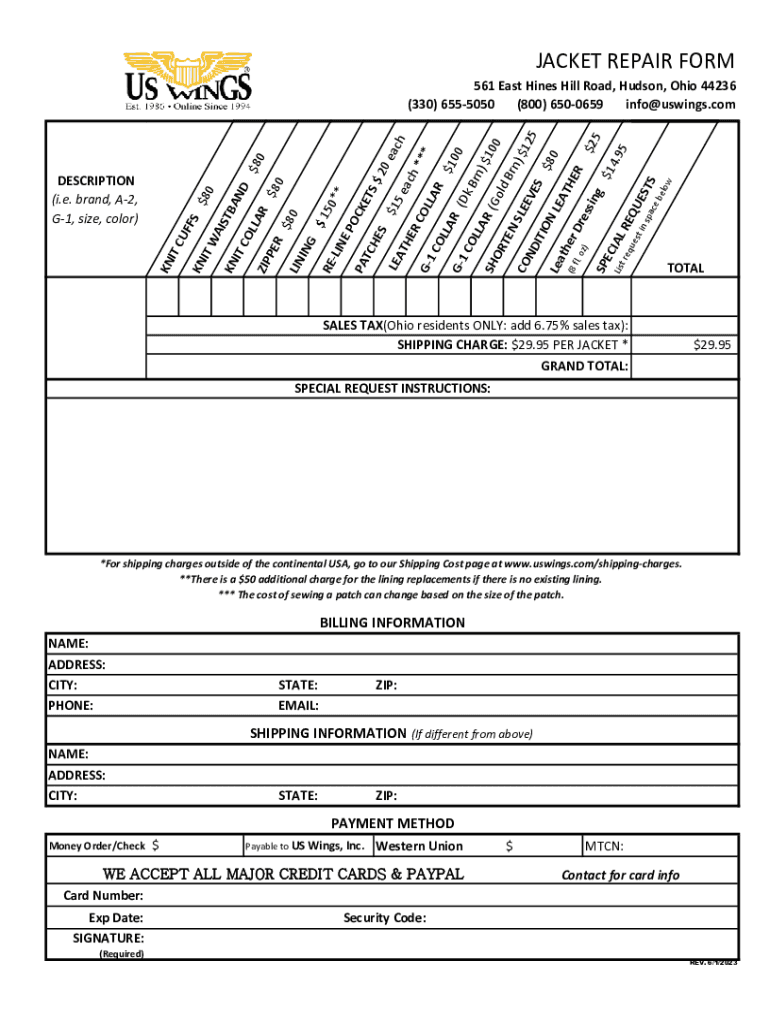 JACKET REPAIR FORM be description (i.e. brand, A2, G1, size, color)KN IT C OF FS KN $80 IT W AIS TB KN AN IT C D OF $80 L A ZIP R PER $$8080 LIN ING $1 RE 50* LIN * EP O CK PA ETS TCH $2 ES 0e $15