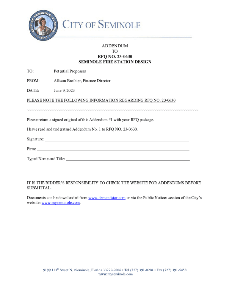 OFSMINOLEADDENDUM TO RFQ NO. 230630 SEMINOLE FIRE STATION DESIGN TO:Potential ProposersFROM:Allison Brother, Finance Directorate:June 9, 2023PLEASE NOTE THE FOLLOWING INFORMATION REGARDING RFQ NO.