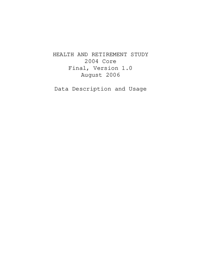 HEALTH AND RETIREMENT STUDY 2004 Core Final, Version 1.0 August 2006 Data Description and Vegetable OF CONTENTS TABLE OF CONTENTS ................................................................................................................................................