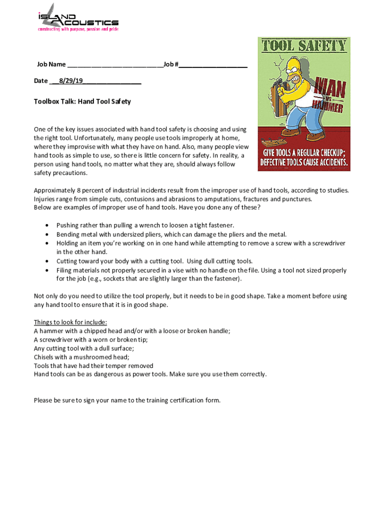 Job Name ___Job #___ Date __8/29/19___Toolbox Talk: Hand Tool Safety One of the key issues associated with hand tool safety is choosing and using the right tool. Unfortunately, many people use tools