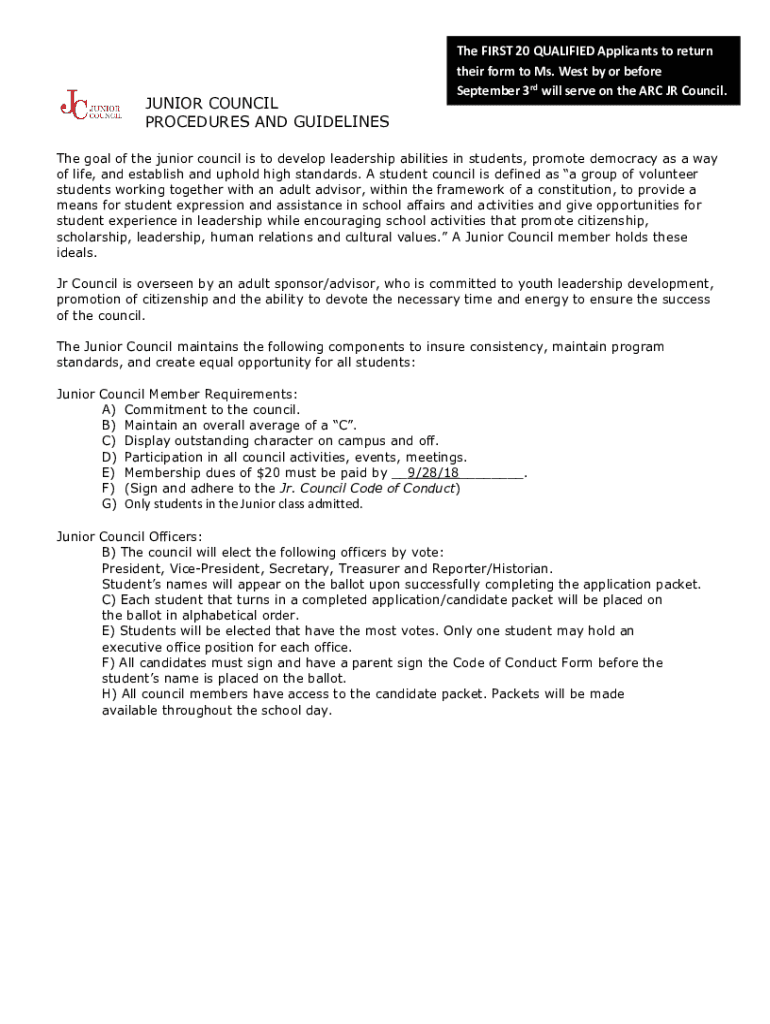JUNIOR COUNCIL PROCEDURES AND Guidelines FIRST 20 QUALIFIED Applicants to return their form to Ms. West by or before September 3rd will serve on the ARC JR Council. The goal of the junior council