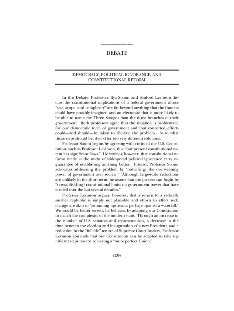 ___DEBATE ___DEMOCRACY, POLITICAL IGNORANCE, AND CONSTITUTIONAL Reforming this Debate, Professors Ilya So min and Sanford Levinson discuss the constitutional implications of a federal government whose