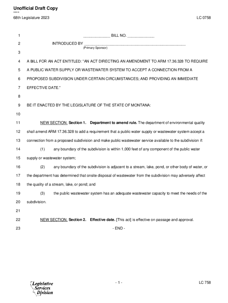 Unofficial Draft Copy **** 68th Legislature 2023LC 07581___ BILL NO. ___2INTRODUCED BY ___ (Primary Sponsor)3 4A BILL FOR AN ACT ENTITLED: AN ACT DIRECTING AN AMENDMENT TO ARM 17.36.328 TO REQUIRE5A