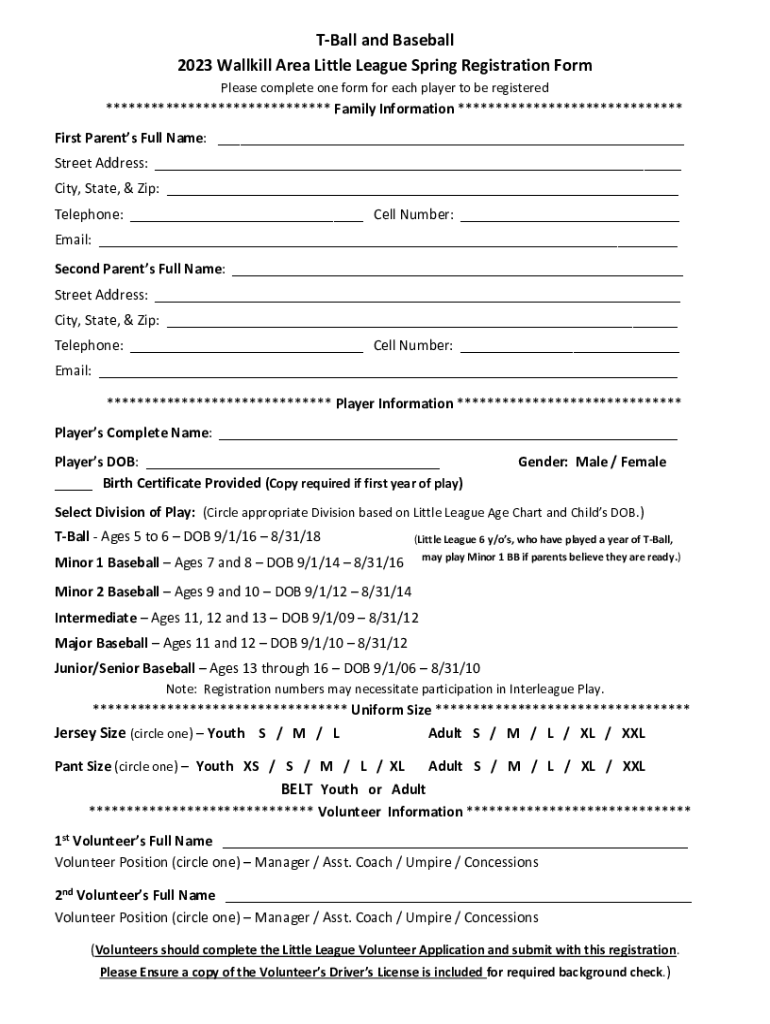 Ball and Baseball 2023 Wall kill Area Little League Spring Registration Form Please complete one form for each player to be registered****************************** Family Information ******************************