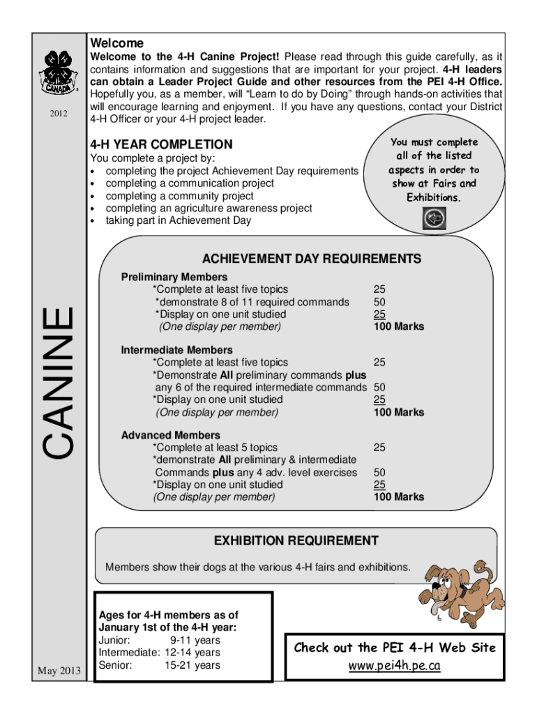 Welcome2012Welcome to the 4H Canine Project! Please read through this guide carefully, as it contains information and suggestions that are important for your project. 4H leaders can obtain a Leader
