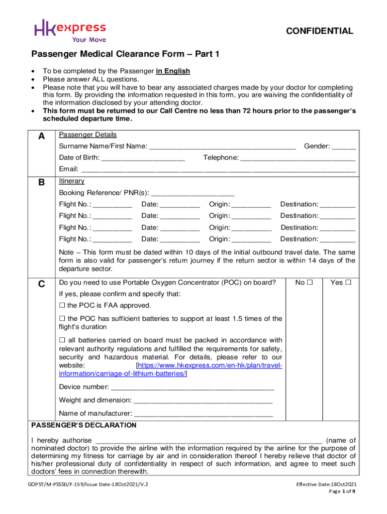 CONFIDENTIAL Passenger Medical Clearance Form Part 1 To be completed by the Passenger in English Please answer ALL questions. Please note that you will have to bear any associated charges made by