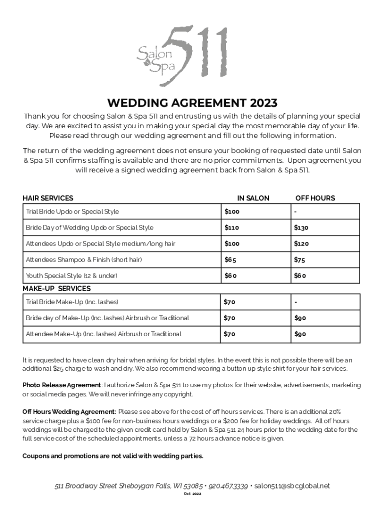 WEDDING AGREEMENT 2023 Thank you for choosing Salon & Spa 511 and entrusting us with the details of planning your special day. We are excited to assist you in making your special day the most memorable