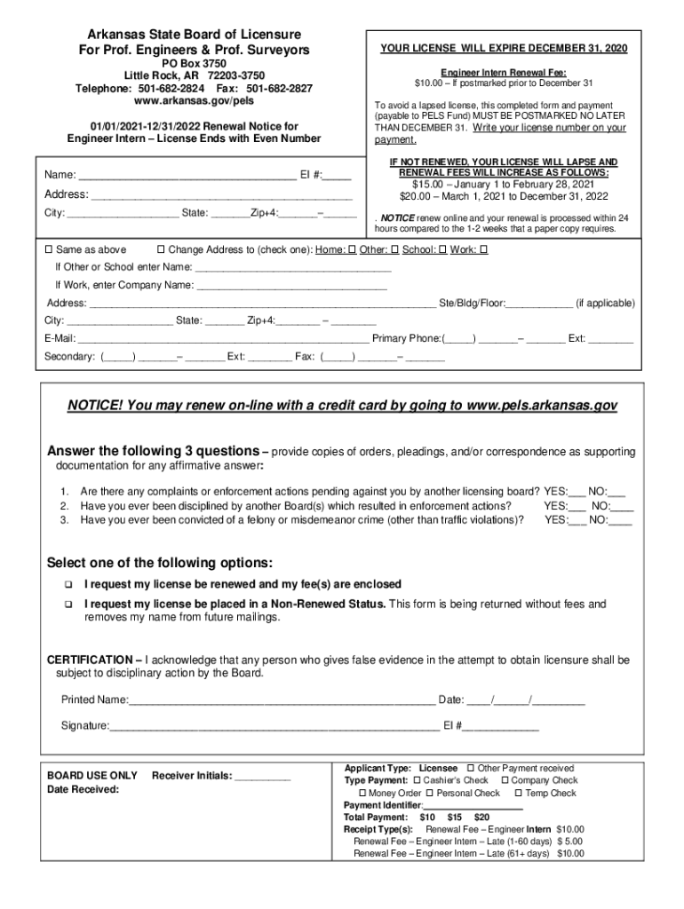 Arkansas State Board of Licensure For Prof. Engineers & Prof. SurveyorsYOUR LICENSE WILL EXPIRE DECEMBER 31, 2020PO Box 3750 Little Rock, AR 722033750 Telephone: 5016822824 Fax: 5016822827 www.arkansas.gov/pelsEngineer