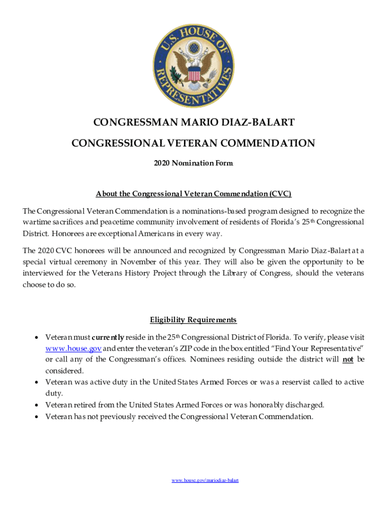 CONGRESSMAN MARIO DIAZBALART CONGRESSIONAL VETERAN COMMENDATION 2020 Nomination Format the Congressional Veteran Commendation (CVC) The Congressional Veteran Commendation is a nominations based program