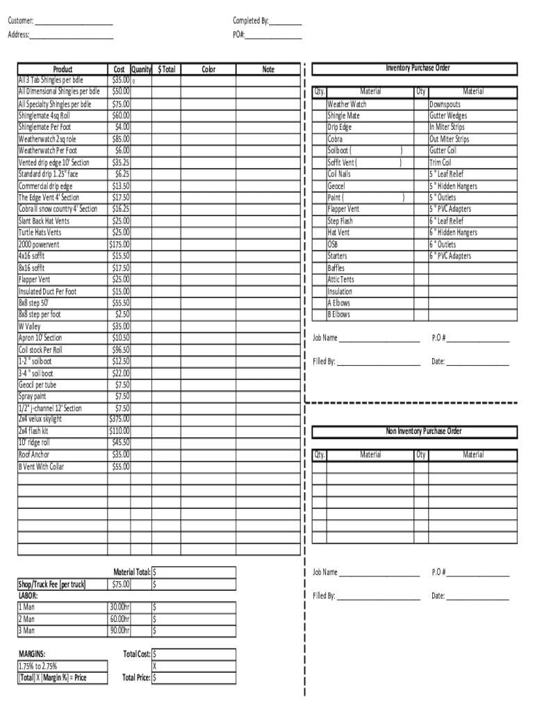 Customer: ___ Address:___ Product All 3 Tab Shingles per bile All Dimensional Shingles per bile All Specialty Shingles per bile Shingle mate 4sq Roll Shingle mate Per Foot Weather watch 2sq role Weather