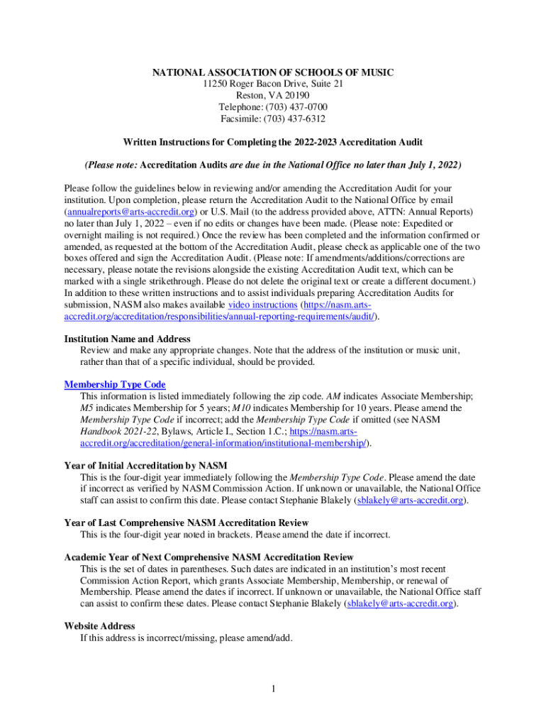 NATIONAL ASSOCIATION OF SCHOOLS OF MUSIC 11250 Roger Bacon Drive, Suite 21 Reston, VA 20190 Telephone: (703) 4370700 Facsimile: (703) 4376312 Written Instructions for Completing the 20222023 Accreditation