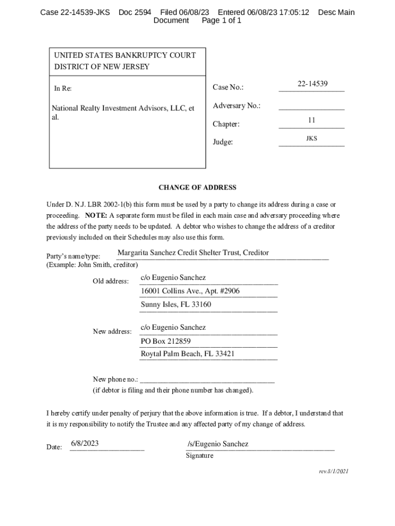 Case 2214539JKSDoc 2594Filed 06/08/23 Entered 06/08/23 17:05:12 Document Page 1 of 1Desc Maintained STATES BANKRUPTCY COURT DISTRICT OF NEW JERSEY In Re:National Realty Investment Advisors, LLC, et