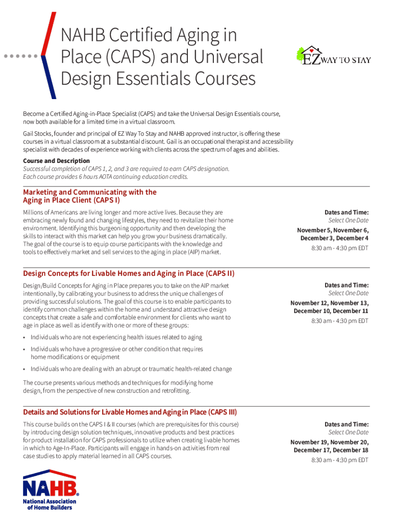 NAB Certified Aging in Place (CAPS) and Universal Design Essentials Courses Become a Certified AginginPlace Specialist (CAPS) and take the Universal Design Essentials course, now both available for