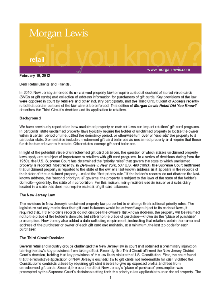 February 10, 2012, Dear Retail Clients and Friends, In 2010, New Jersey amended its unclaimed property law to require custodial Scheat of stored value cards (Sacs or gift cards) and collection of