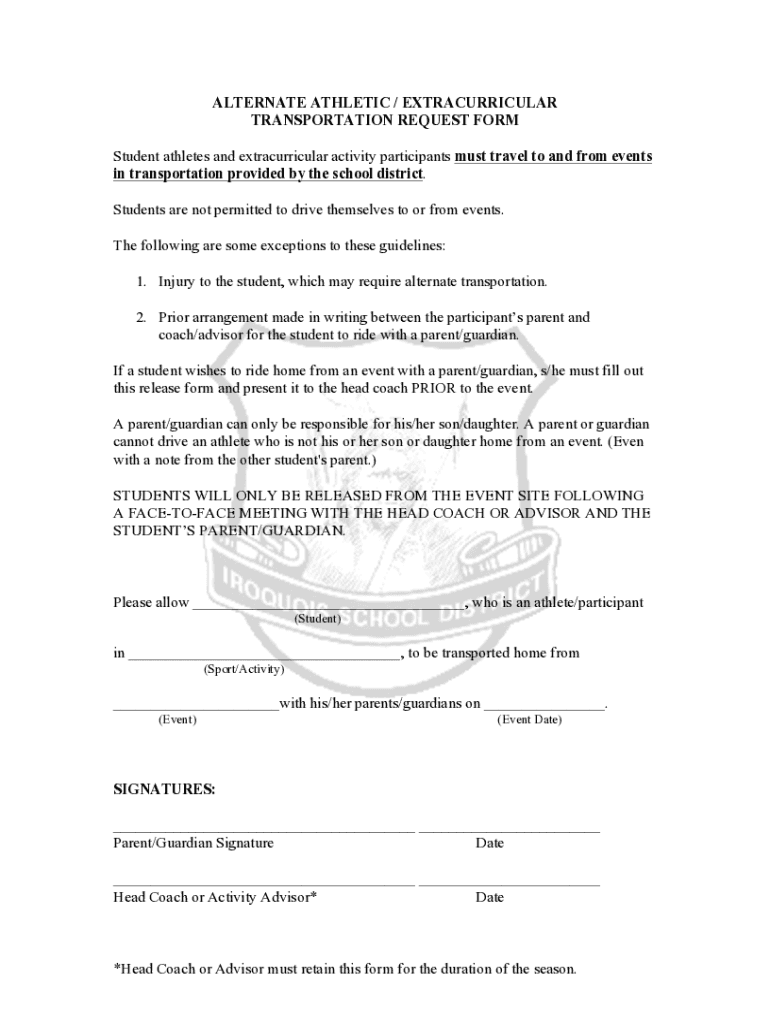 ALTERNATE ATHLETIC / EXTRACURRICULAR TRANSPORTATION REQUEST FORM Student athletes and extracurricular activity participants must travel to and from events in transportation provided by the school