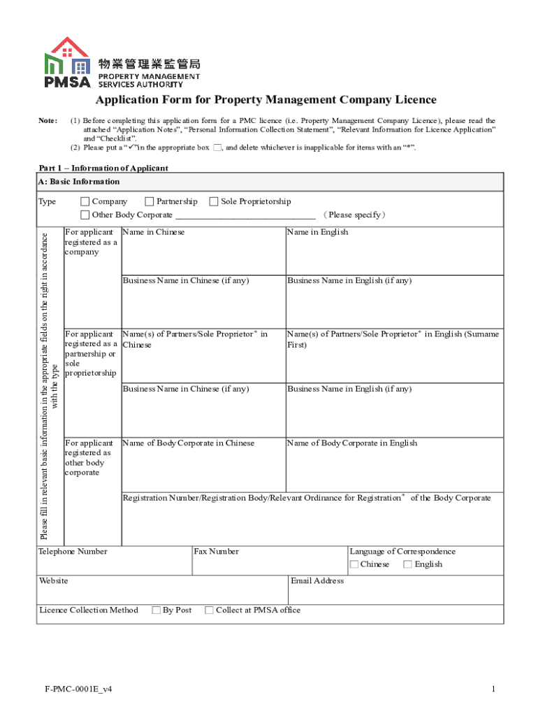 Application Form for Property Management Company License Note:(1) Before completing this application form for a PMC license (i.e. Property Management Company License), please read the attached Application