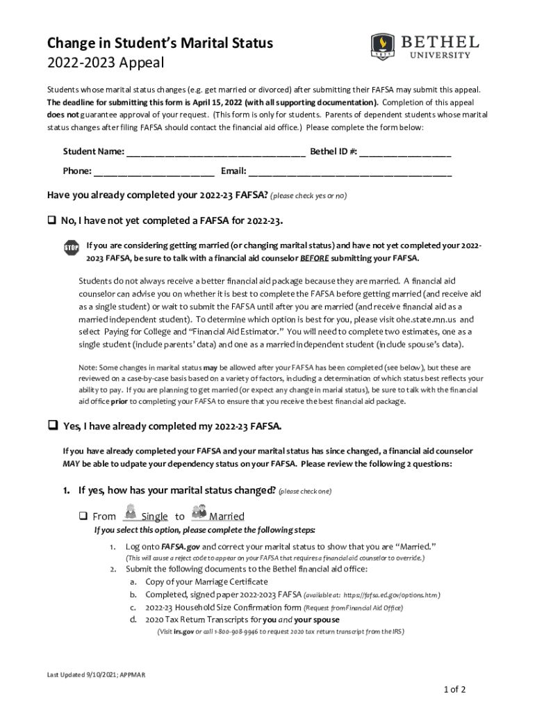 Studentswhosemaritalstatuschanges(e.g.getmarriedordivorced)aftersubmittingtheirFAFSAmaysubmitthisappeal.