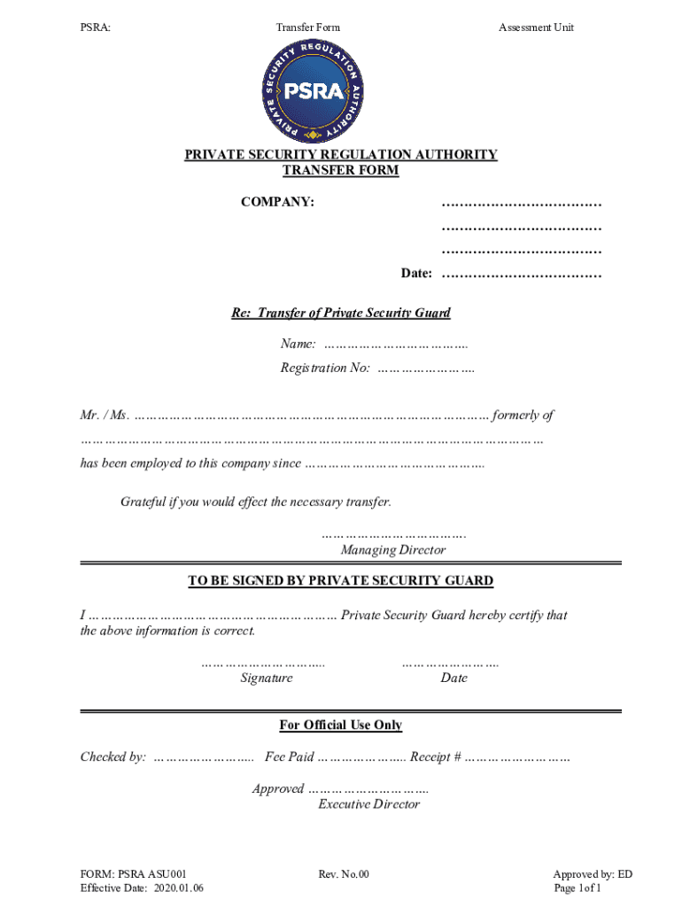 PSA:Transfer Reassessment Univariate SECURITY REGULATION AUTHORITY TRANSFER FORM COMPANY: Date: Re: Transfer of Private Security Guard Name:. Registration No:. Mr. / Ms. formerly of