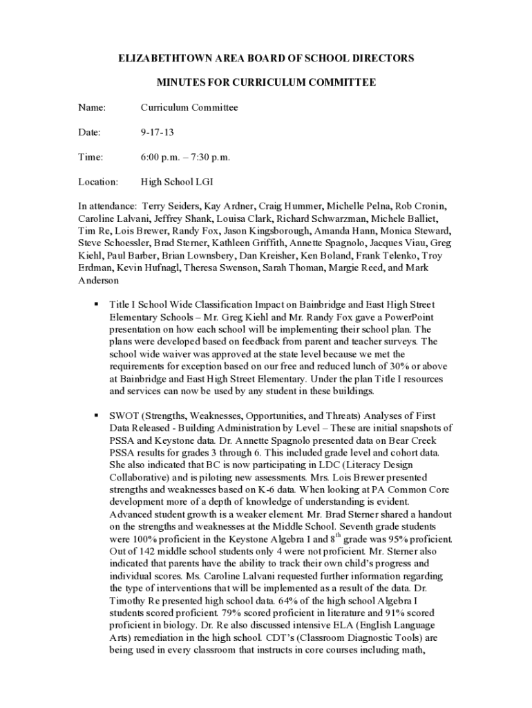 ELIZABETHTOWN AREA BOARD OF SCHOOL DIRECTORS MINUTES FOR CURRICULUM COMMITTEE Name:Curriculum Committeeman:91713Time:6:00 p.m. 7:30 p.m. Location:High School Again attendance: Terry Spiders, Kay Gardner,