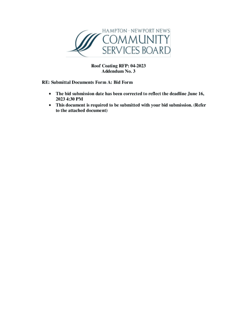 Roof Coating RFP: 042023 Addendum No. 3 RE: Submittal Documents Form A: Bid Form The bid submission date has been corrected to reflect the deadline June 16, 2023 4:30 PM This document is required