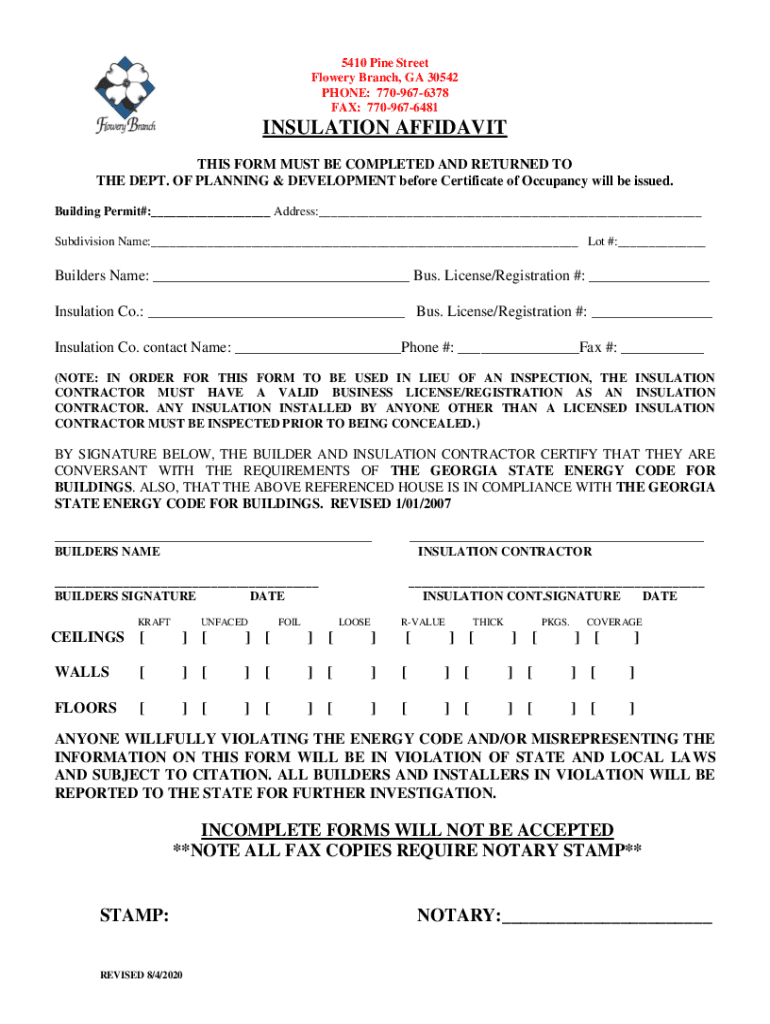5410 Pine Street Flowery Branch, GA 30542 PHONE: 7709676378 FAX: 7709676481INSULATION AFFIDAVIT THIS FORM MUST BE COMPLETED AND RETURNED TO THE DEPT. OF PLANNING & DEVELOPMENT before Certificate of