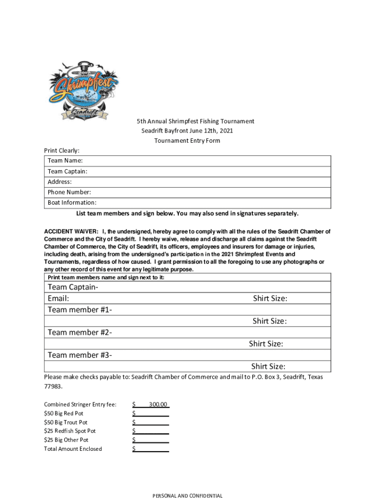 5th Annual Shrimp fest Fishing Tournament Se adrift Bay front June 12th, 2021 Tournament Entry Form Print Clearly: Team Name: Team Captain: Address: Phone Number: Boat Information: List team members