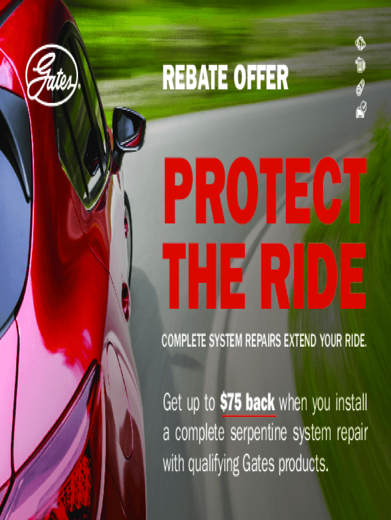 REBATE OVERPROTECT THE INCOMPLETE SYSTEM REPAIRS EXTEND YOUR RIDE. Get up to $75 back when you install a complete serpentine system repair with qualifying Gates products. SERPENTINE SYSTEM PROMOTION
