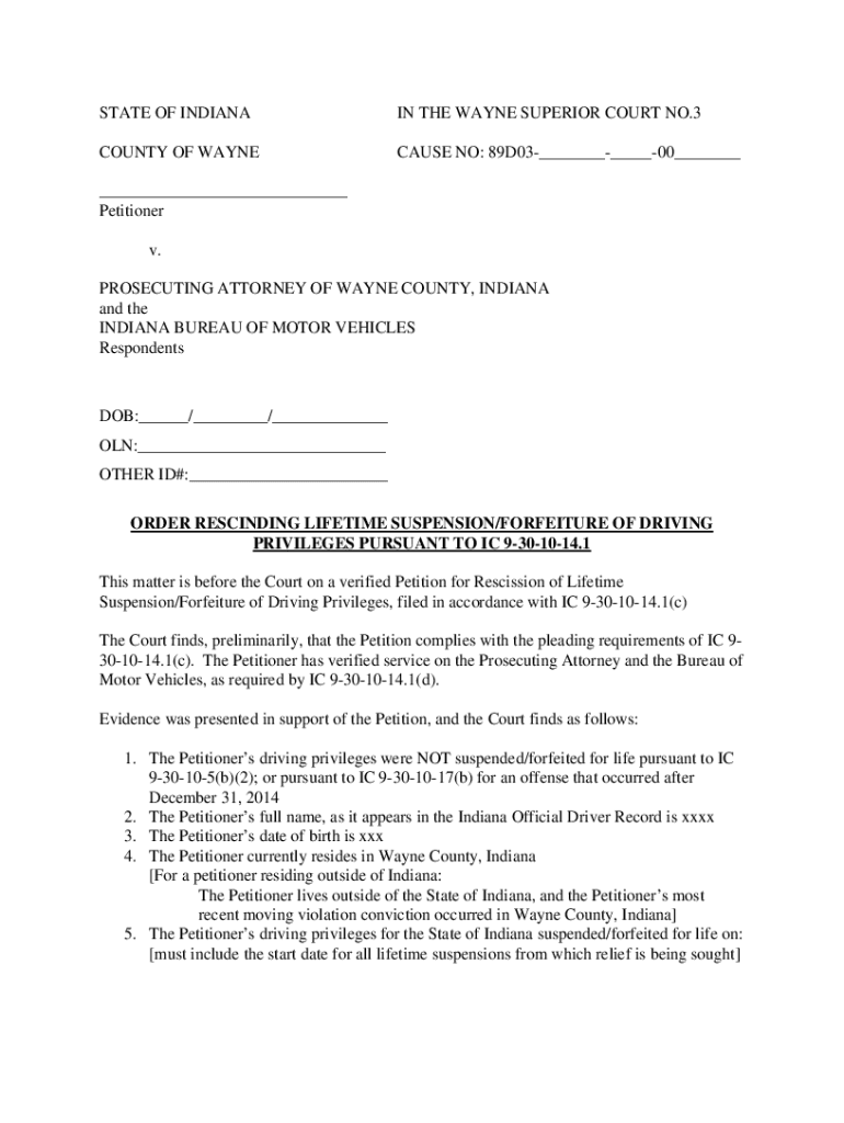 STATE OF INDIANAN THE WAYNE SUPERIOR COURT NO.3COUNTY OF WAYNECAUSE NO: 89D03______00______ Petitioner v. PROSECUTING ATTORNEY OF WAYNE COUNTY, INDIANA and the INDIANA BUREAU OF MOTOR VEHICLES Respondents