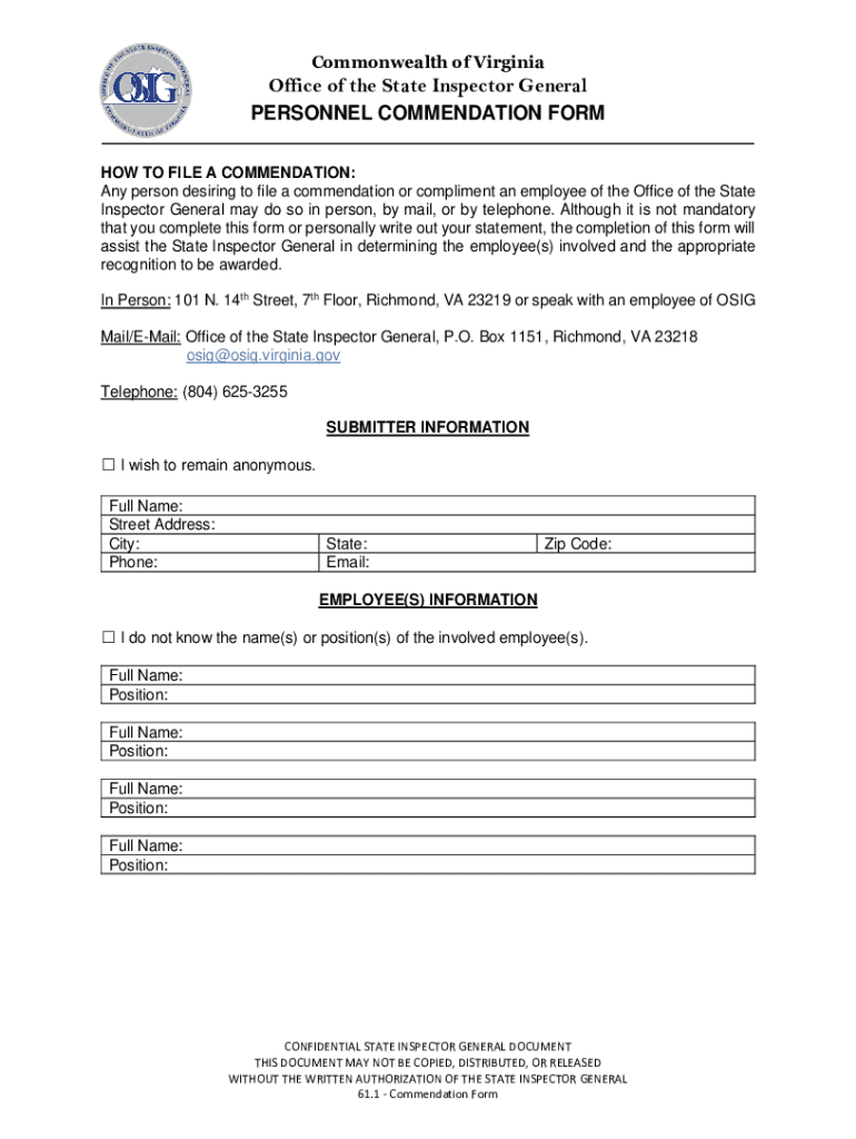 Commonwealth of VirginiaOffice of the State Inspector General PERSONNEL COMMENDATION FORM HOW TO FILE A COMMENDATION: Any person desiring to file a commendation or compliment an employee of the Office