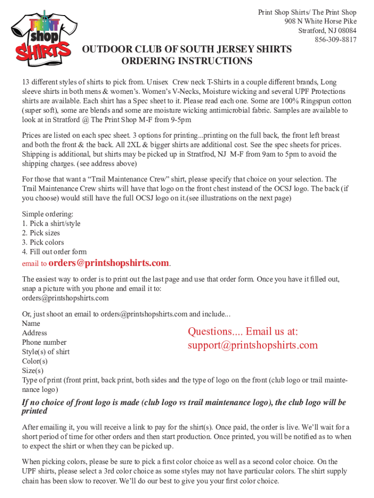 Print Shop Shirts/ The Print Shop 908 N White Horse Pike Stratford, NJ 08084 8563098817OUTDOOR CLUB OF SOUTH JERSEY SHIRTS ORDERING INSTRUCTIONS 13 different styles of shirts to pick from. Unisex