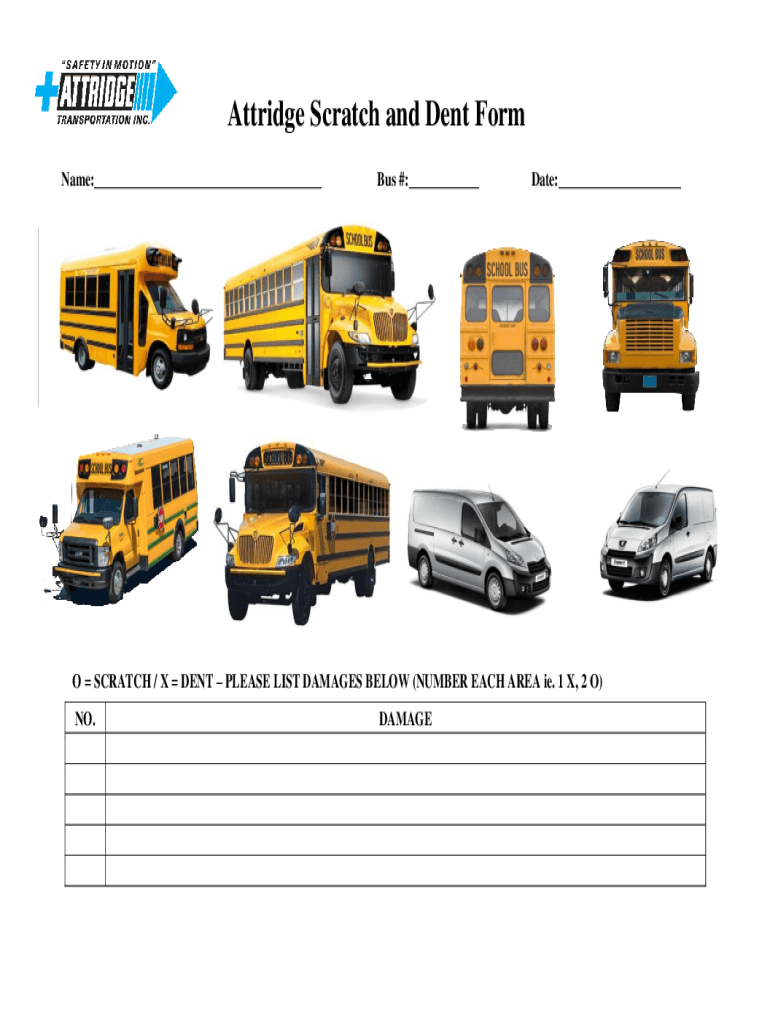 Cartridge Scratch and Dent Form Name:___Bus #:___Date:___O SCRATCH / X DENT PLEASE LIST DAMAGES BELOW (NUMBER EACH AREA i.e. 1 X, 2 O) NO.DAMAGE