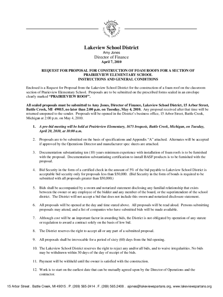 Lake view School District Amy JonesDirector of Finance April 7, 2010, REQUEST FOR PROPOSAL FOR CONSTRUCTION OF FOAM ROOFS FOR A SECTION OF PRAIRIEVILLE ELEMENTARY SCHOOL INSTRUCTIONS AND GENERAL CONDITIONS